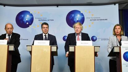 La jefa de la diplomacia comunitaria decidió convocar el encuentro de Bruselas cuando Estados Unidos, socio clave en el marco que garantiza que Irán no tendrá capacidad para fabricar la bomba nuclear, comenzó a apartarse del compromiso. China y Rusia, las otras dos potencias firmantes, siguen apoyando su aplicación. A pocas horas de que el presidente estadounidense, Donald Trump, decida si mantiene la supresión de las sanciones al país persa que estipulaba el acuerdo, la UE le pidió que no cambie el rumbo. “Es importante que nuestros aliados americanos lo respeten. No hay razón particular para romperlo. Eso significa que se mantenga también la supresión de sanciones”, precisó el ministro francés de Exteriores, Jean-Yves Le Drian. Tanto el representante francés como sus colegas alemán, Sigmar Gabriel, y británico, Boris Johnson, comparecieron junto a Mogherini tras la reunión con el ministro iraní.