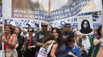 Un puñado de mujeres sostenía este sábado una bandera en uno de los laterales de la Avenida de Mayo de Buenos Aires. Se las veía nerviosas y emocionadas. A su alrededor, decenas de miles de personas se preparaban para marchar hacia la Plaza de Mayo en una nueva movilización por el 42º aniversario del golpe militar que dio paso a la última dictadura argentina, la más despiadada. El texto de la pancarta -"Historias desobedientes. Hijas, hijos y familiares de genocidas por la Memoria, la Verdad y la Justicia"- provocó la sorpresa de muchos de quienes la leían. Segundos después, les dedicaban una sonrisa, levantaban el pulgar en señal de aprobación, o se acercaban para sacarse una selfie con ellas y conocer más a fondo su historia.