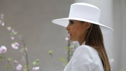 Se prodiga tan poco Melania Trump y es tan poco lo que habla, que buena parte de la cobertura mediática estadounidense sobre la primera dama se ha convertido en un ejercicio de agudeza visual. Si rehúye o no rehúye la mano de su esposo en el posado del día apunta ya a género periodístico. Cuando en su aniversario como primera dama publica una foto de ella sola del brazo de un marine, se puede leer su malestar por el escándalo de Donald Trump y la actriz de cine porno Stormy Daniels. Y si en la visita de Estado del presidente de Francia, Emmanuel Macron, luce un sombrero blanco, no es que lo lleve, sino que está haciendo diplomacia a través de la moda.