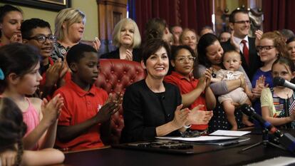 La gobernadora republicana de Iowa, Kim Reynolds, firmó la ley antiaborto el viernes rodeada de lobistas, niños y pastores. Fuera protestaba un grupo de mujeres a la voz de “¡Mi cuerpo, mi decisión!”. Antes de estampar su rúbrica, Reynolds declaró: “Para mí, toda vida inocente es única y sagrada, y en el día de hoy como gobernadora estoy haciendo todo lo que está en mi mano por protegerla”. En la calle, Jennifer Weatherby, de 32 años, una manifestante citada por el diario local The Des Moines Register, criticaba: “Todos sabemos que un veto al aborto no acabará con los abortos, así que esto solamente estaría acabando con el aborto seguro y poniendo en peligro a las mujeres”. La gobernadora, asimismo, se mostró consciente de que a la ley le queda por delante un camino de litigio y sentenció: “Yo no voy a desistir de mis creencias. Esto va más allá de la mera ley. Esto tiene que ver con la vida”.