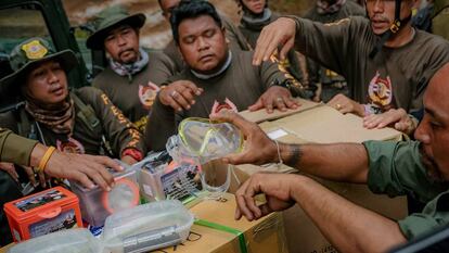 Si durante nueve días estuvieron a oscuras y a solas, la cámara de la cueva de Tham Luang (norte de Tailandia) donde se encuentran bulle ahora de actividad. Les acompañan enfermeros, psicólogos, infantes de Marina y buceadores les han llevado alimentos y medicinas que podrán durar cuatro meses, para ponerse en el caso más extremo: que las lluvias continúen bloqueando hasta finales de la temporada del monzón, en octubre, las entradas de la cueva.