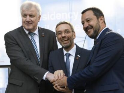 Kickl y sus homólogos alemán, Horst Seehofer, e italiano, Matteo Salvini, mantuvieron a primera hora de la mañana un desayuno trilateral para acercar posiciones. Viena, Roma y Múnich (la capital de Baviera, el Estado alemán donde gobierna la CSU, el partido de Seehofer) se han propuesto forjar un eje de acción política ultraconservadora en el seno de la UE. Tras la reunión, indicaron que unirán esfuerzos para reforzar las fronteras exteriores de la UE, con la idea de limitar al máximo la llegada de migrantes. “Hemos acordado que queremos poner orden”, dijo el representante austriaco. “Queremos enviar el mensaje de que no será posible pisar suelo europeo si no se tiene derecho a protección internacional”, añadió. Los tres volverán a reunirse en Viena el 19 de julio para avanzar en su proyecto migratorio.