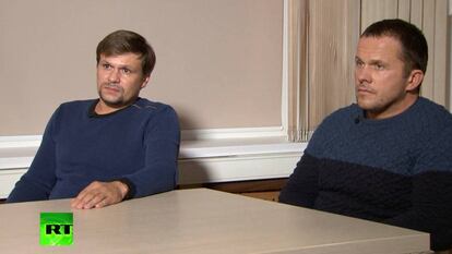 Alexander Petrov y Ruslán Boshirov, los dos hombres señalados por el Reino Unido como sospechosos del envenenamiento del exespía ruso Serguéi Skripal y de su hija Yulia en marzo pasado, dijeron este jueves que fueron a Salisbury "como turistas" y que no llevaban "ningún veneno".
