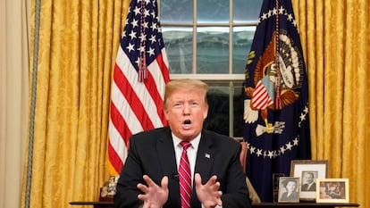 El presidente Donald Trump se ha dirigido a la nación desde el despacho oval de la Casa Blanca este martes, en un mensaje televisado en horario de prime time, para tratar de convencer a los estadounidenses de que existe una "creciente crisis humanitaria y de seguridad" en la frontera sur del país, "una crisis del corazón y el alma", y de que necesita obtener del Congreso los más de 5.000 millones de dólares que reclama para levantar el muro con México. Solo así, ha dicho, podrá poner fin al cierre parcial del Gobierno, que el pasado domingo entró en su tercera semana y que amenazó con mantener durante "meses e incluso años", y del que ha responsabilizado a los demócratas.
