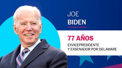 Primero en las encuestas y símbolo del establishment demócrata. El senador de Delaware (1973-2009) y vicepresidente durante la administración de Barack Obama lleva casi medio siglo dedicado a la política, lo que le supone ventajas y problemas. En los debates le suelen achacar que votó a favor de la guerra de Irak o la forma en que lideró el interrogatorio a Anita Hall en el Senado contra el juez Clarence Thomas. El candidato de 76 años, blanco, católico y de origen irlandés, esquiva los dardos haciendo gala de su experiencia. Tanto los latinos como los afroamericanos, dos comunidades muy importantes en las bases del Partido Demócrata lo tienen a él como primera opción.