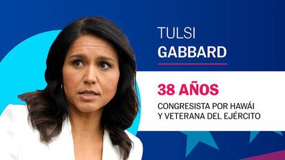 Congresista por Hawái, de 38 años, fue la primera hindú en ocupar un escaño en el Capitolio. Veterana de Irak, es crítica con las intervenciones militares en el exterior, incluido en Siria. Apoyó a Bernie Sanders en 2016, defiende la legalización del aborto, y cita entre sus prioridades la lucha contra la pobreza, el cambio climático y la asistencia sanitaria. Pero cierta ambigüedad hacia Donald Trump tras su victoria y, sobre todo, su dura oposición al matrimonio homosexual (de la que luego se ha retractado), han suscitado escepticismo entre sus pares. Este se vio agravado cuando se abstuvo en la votación del impeachment a Trump.