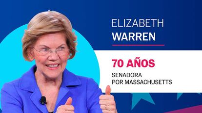 Es una de las figuras más conocidas del partido a pesar de que no ostentó un cargo público hasta 2013, cuando se convirtió en la primera mujer senadora por Massachusetts. Sus críticas al capitalismo salvaje la convirtieron en la preferida del ala izquierda del partido. La profesora de Derecho en Harvard no ha eludido la confrontación directa con Trump, que suele referirse a ella como "Pocahontas", una burla por sus lejanos orígenes nativo americanos. Despierta recelos entre los demócratas moderados con sus propuestas de un sistema de salud público y universal o la condonación de gran parte de las deudas estudiantiles. Con una efectiva campaña, ha logrado posicionarse entre los primeros puestos de las encuestas.