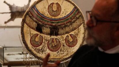 El chimalli de Chapultepec se exhibe en una vitrina que permite ver ambos lados del escudo. Mientras el anverso es la cara más conocida del tesoro, con sus plumas de colores, el reverso muestra la detallada tarea de los artesanos aztecas con diversos materiales que han perdurado durante cinco siglos. “Su estado de conservación es estable, pero una vez que terminé la exposición se guardará”, señala la investigadora. El chimalli, al estar compuesto, principalmente, de elementos orgánicos, no debe permanecer sobreexpuesto a la luz. El tesoro de Moctezuma volverá en tres meses a resguardo.