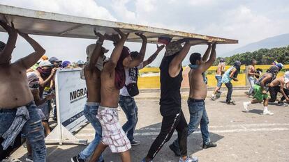 El lado colombiano no tardó en tornarse también en una especie de batalla campal. La postal en el puente Simón Bolívar era esquizofrénica. Una masa de voluntarios acompañaba a los camiones cargados de ayuda humanitaria —medicinas y alimentos— al grito de “¡libertad!”, al tiempo que comenzaban los disturbios. Mientras el primer camión avanzaba por el puente, desde los megáfonos de los voluntarios se pedía que nadie que fuese subido al camión llevara la cara tapada. En un momento dado, tuvieron que detener el vehículo para evitar un embudo que hubiese provocado una tragedia: la represión de los uniformados no cesaba. Bombas lacrimógenas es lo que recibieron los voluntarios que acompañaban al cargamento.
