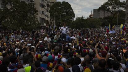 A esa situación se suma el clima de máxima polarización política que acompaña el desafío de Guaidó al sucesor de Hugo Chávez. La policía cerró el paso a los manifestantes con gases lacrimógenos al comienzo de las concentraciones y rodeó la Avenida de la Victoria, punto de llegada de las marchas. De madrugada, las fuerzas de seguridad habían detenido a tres operarios que montaban el escenario desde el que el político venezolano tenía previsto dirigirse a los suyos. Con estos obstáculos no logró hacerlo en condiciones normales y tuvo que hablar desde el techo de un vehículo, megáfono en mano.