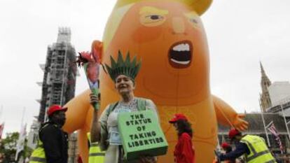 La logística desplegada en Londres durante la visita de Estado ha evitado en todo momento que Trump pisara la calle, y ha desviado recorridos para vadear las protestas contra su presencia. Por eso los miles de manifestantes que expresaron este martes su malestar con el trato dado al político estadounidense, no fueron, según él, más que “un pequeño grupo de gente puesto allí por motivos políticos”. Una vez más, se trataba de “falsas noticias” frente a la realidad que él había visto y que describió: “Miles de personas agitando banderas estadounidenses y británicas a su llegada al Palacio de Buckingham, en una clara muestra de amor”.