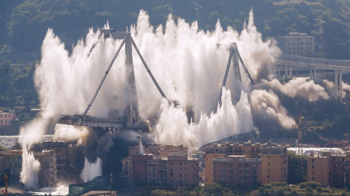 Los dos pilares que quedaban aún en pie del emblemático puente Morandi de Génova, en el noroeste de Italia, que en agosto de 2018 sufrió un derrumbe parcial que causó la muerte de 43 personas, han sido demolidos este viernes de manera controlada con una espectacular explosión en la que se ha utilizado cerca de una tonelada de dinamita, según han informado las autoridades. A las 9.37 (hora italiana) se oyó una sirena y se accionaron los chorros de agua para crear un muro que evitase la difusión de las partículas de polvo. Después, con la explosión de las 15 cargas colocadas, los dos pilares del puente se desplomaron en seis segundos.