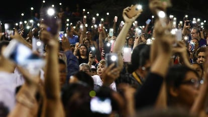 La vigilia terminaba con la noche ya cerrada, apenas iluminada por las luces de las velas y las linternas de los teléfonos móviles. La multitud se diluía al ritmo de los mariachis que interpretaban, amplificados por poderosos altavoces, la ranchera Amor eterno, de Juan Gabriel, que el recuerdo de las víctimas teñía de una particular tristeza: “Cómo quisiera que tú vivieras / Que tus ojitos jamás / Se hubieran cerrado nunca / Y estar mirándolos”.