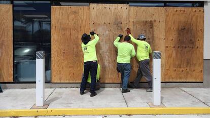 Trabajadores cubren los ventanales ante la posible llegada del huracán Dorian en Miami. En vídeo, EEUU, pendiente de la amenaza de Dorian.Foto: atlas | Vídeo: AFP | ATLAS
