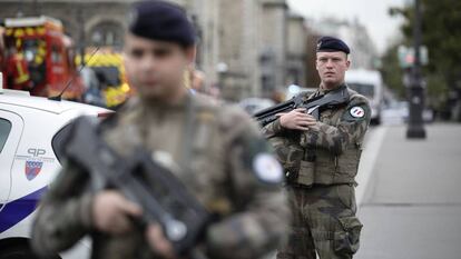 Varios soldados armados patrullan la sede de la Policía en París. En vídeo, la policía acordona la prefectura de París tras el ataque de este jueves.Vídeo: afp / quality-reuters