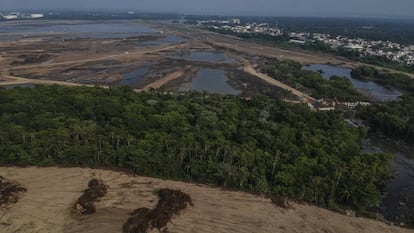 La planta para procesar petróleo crudo se construye deprisa en el municipio de Paraíso, una localidad de 80.000 habitantes frente a las costas del golfo de México. En el terreno adyacente al puerto de Dos Bocas, decenas de camiones sacan tierra del solar de 700 hectáreas para comenzar a construir los cimientos del proyecto. Antes de esta escena, la región era toda verde: un manglar que se perdía entre los ríos que rodean a Paraíso. Solo en diciembre, el Gobierno mexicano arrasó con 270 hectáreas —más de 200 veces las dimensiones del Estadio Azteca— de vegetación, según datos de Global Forest Watch. La construcción de la refinería comenzó oficialmente en junio, sin embargo, la tala y remoción del manglar continúa hasta la fecha, según ha podido comprobar este diario.