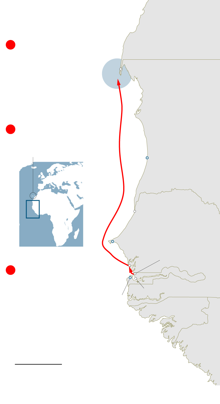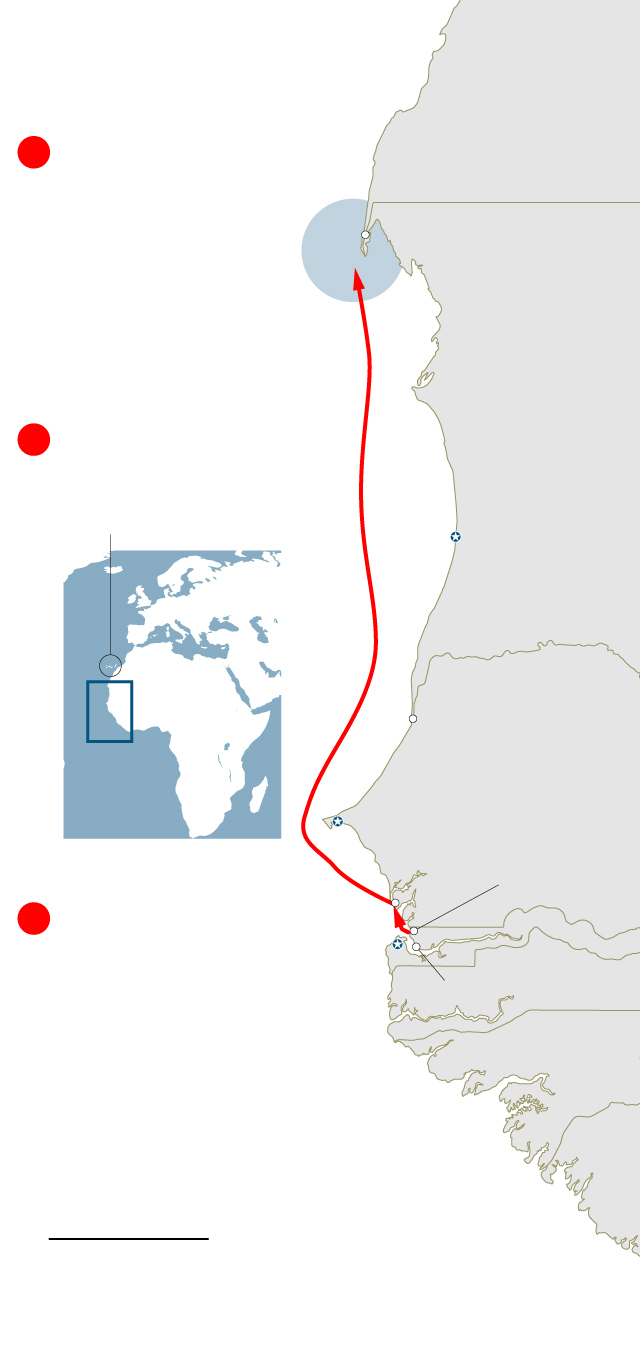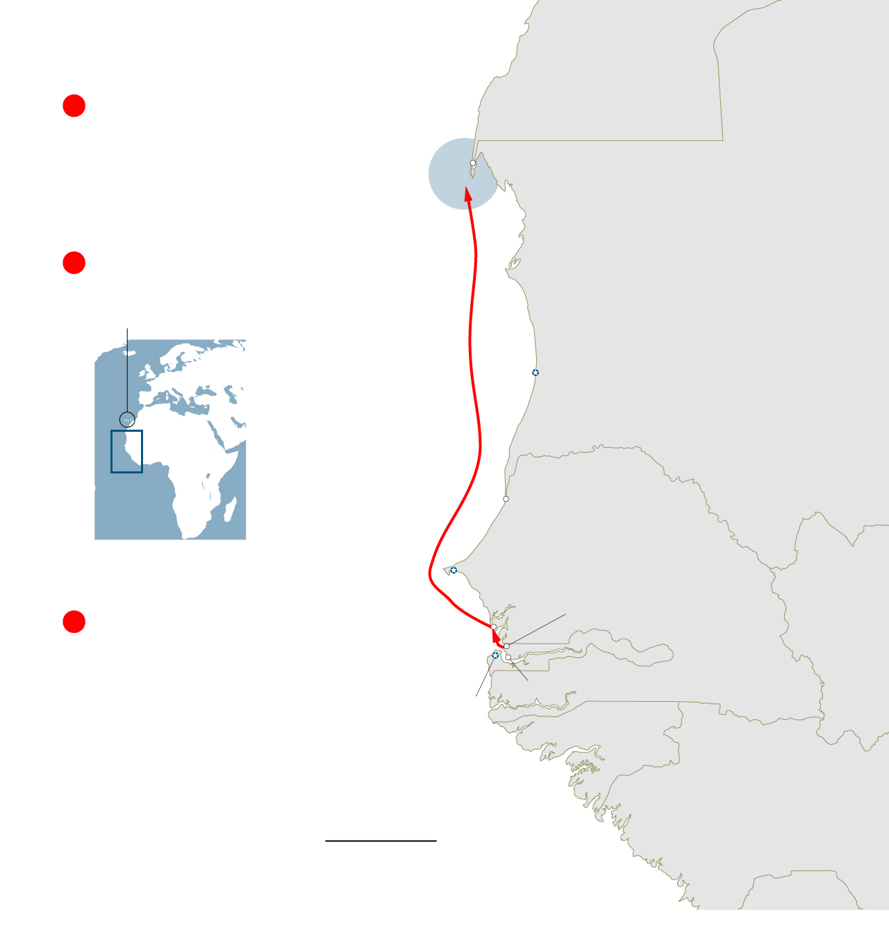 La cita era en la isla de Ginak, cerca de Barra, el 27 de noviembre por la noche. Tras navegar durante varias horas llegaron a Niodior, al sur de Senegal. Allí montaron en una embarcación más grande que estaba escondida entre los vericuetos de la desembocadura del río Saloum, al amparo de miradas indiscretas, protegidos por el manglar. La expedición estaba completa y pusieron proa a Canarias. Tras cuatro o cinco días de singladura comenzaron los problemas. Se les había acabado la comida, “arroz y galletas” recuerda el joven superviviente Cheikh Diuf, y el combustible escaseaba. Estaban a una veintena de kilómetros al norte de la ciudad mauritana de Nuadibú, en aguas del Sahara Occidental.