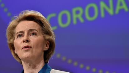 La presidenta de la Comisión Europea, Ursula von der Leyen, durante un acto en Bruselas, este mes. En vídeo, Von der Leyen anuncia el financiamiento para desarrollar, producir y distribuir una vacuna contra el coronavirus, este lunes en Bruselas.Vídeo: REUTERS