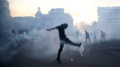 La policía ha utilizado balas reales después de que manifestantes y antidisturbios se hayan enzarzado entre gases lacrimógenos lanzados por las fuerzas de seguridad y piedras arrojadas por los participantes en los alrededores del Parlamento de la capital libanesa, donde ha comenzado la protesta. “La sangre de inocentes ha llegado a la calle, ahora no hay marcha atrás”, dice la activista Nadim Khanj. Ante el panorama, el Ejército y cientos de agentes han sido desplegados por la ciudad, donde se están cortando las calles que llevan al centro, se están quemando fotos del presidente, Michel Aoun, y se están entonando cánticos contra Hezbolá. Los militares jubilados se han sumado a las protestas, y uno de ellos ha liderado la toma del Ministerio de Asuntos Exteriores, cuyo control ha sido recuperado por el ejército a última hora de la tarde. Varios coches de bomberos se han negado a usar cañones de agua contra los manifestantes, según medios locales.