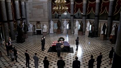 La legendaria juez del Tribunal Supremo Ruth Bader Ginsburg se convirtió este viernes en la primera mujer y la primera persona judía velada con honores de Estado en el Congreso. Ginsburg, fallecida hace justo una semana a los 87 años, hizo historia en la lucha por la igualdad de género a lo largo de toda su carrera, como abogada y como magistrada. En un Washington que amaneció nublado, con el país sumido en una conmoción profunda por la pandemia y la fractura política, la jurista adorada como una estrella de rock por las nuevas generaciones rompió su última barrera.