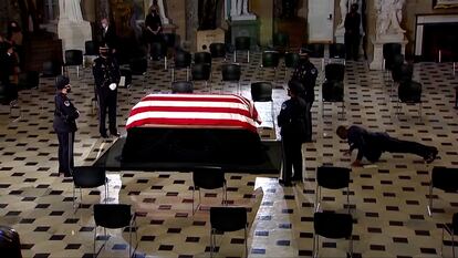 El féretro llegó a las puertas del Capitolio sobre las 10 de la mañana, cubierto por la bandera estadounidense, tras dos días de capilla ardiente en el Tribunal Supremo, durante los que miles de personas han acudido a presentar sus respetos. Representantes de los distintos cuerpos de las Fuerzas Armadas vestidos de gala lo cargaron por la escalinata y lo posaron sobre el mismo sepulcro construido para acoger los restos de Abraham Lincoln en el Statuary Hall, la sala circular con estatuas de las figuras más prominentes de la historia americana.