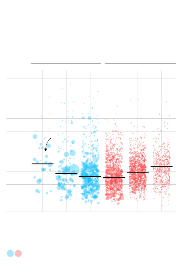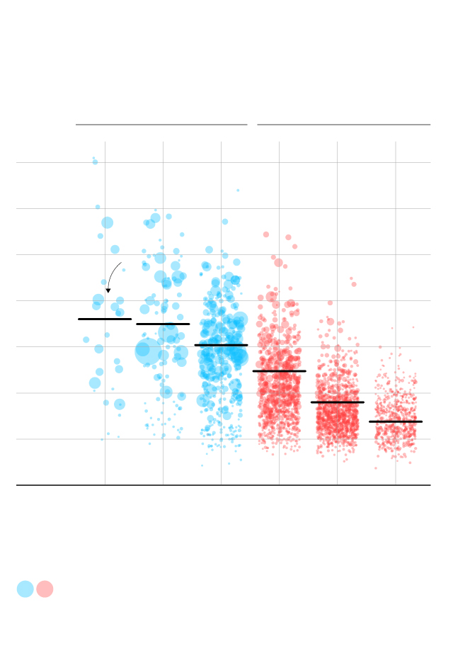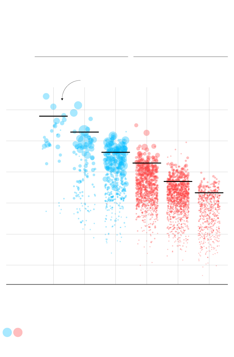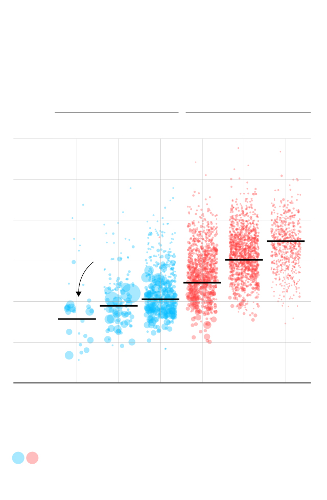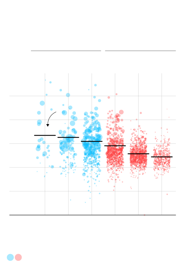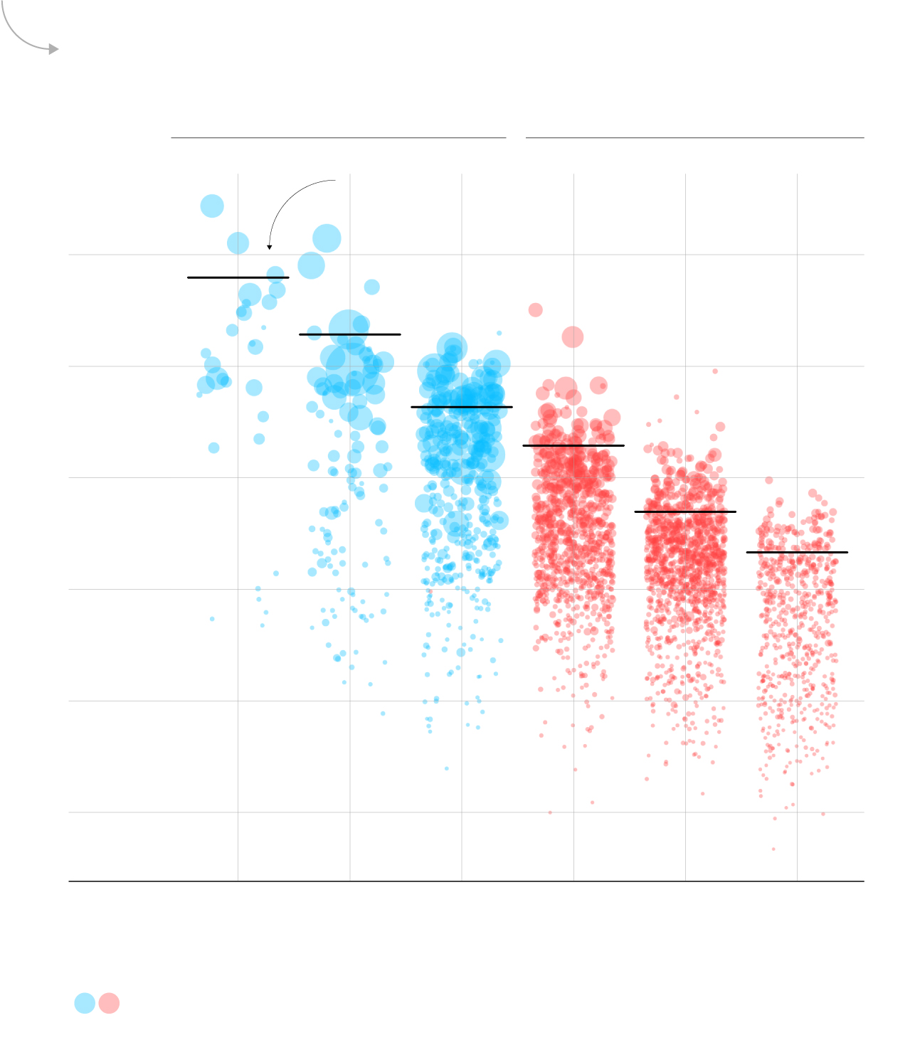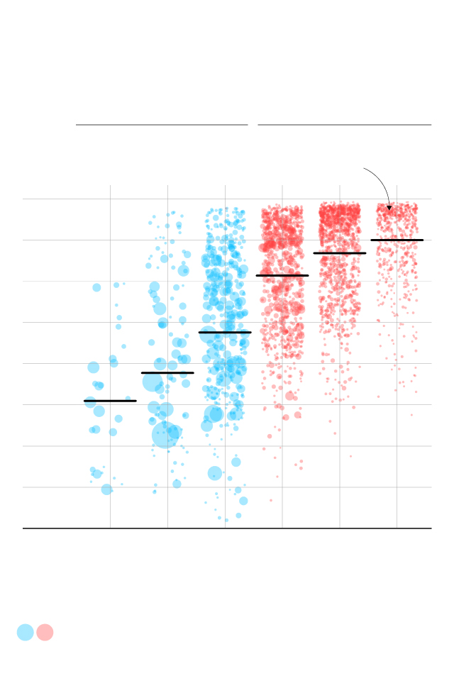 Es el eje más claro. Los condados donde el republicano gana por 60 puntos o más son siempre lugares poco densos, con una media ponderada de 20 habitantes por kilómetro cuadrado. En cambio, los feudos de Biden son ciudades, donde la densidad media supera los 6.000 habitantes por kilómetro cuadrado. La brecha existe también en los condados más igualados. Los territorios que Biden ganó, pero sin una clara victoria (por menos de 33 puntos), son el doble de densos que aquellos donde lo hizo Trump.
