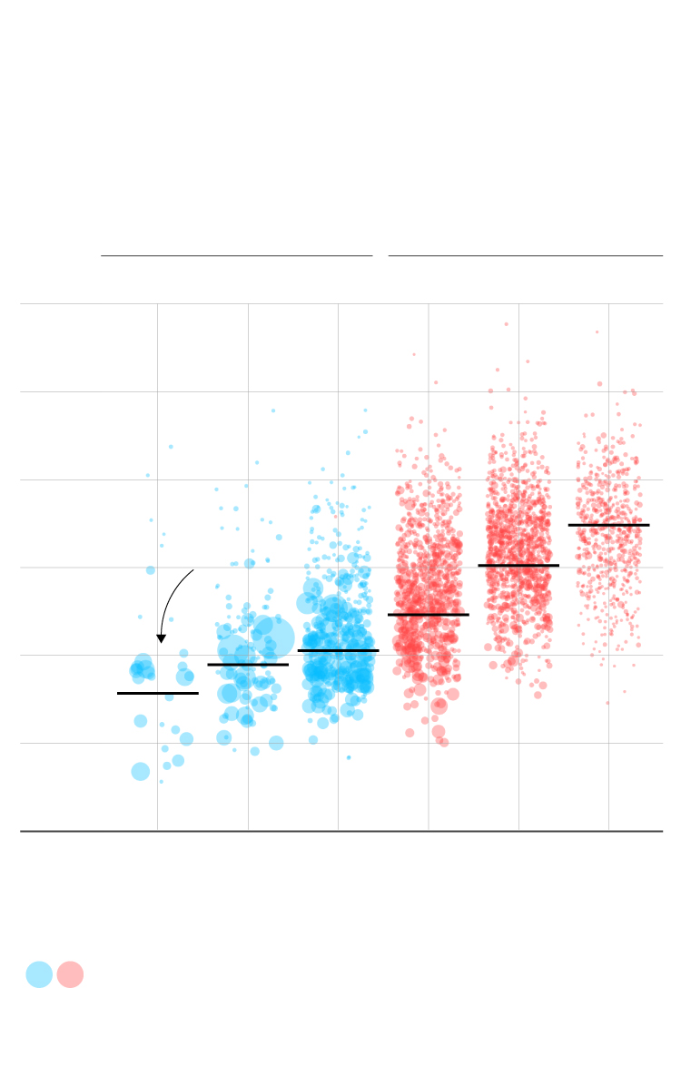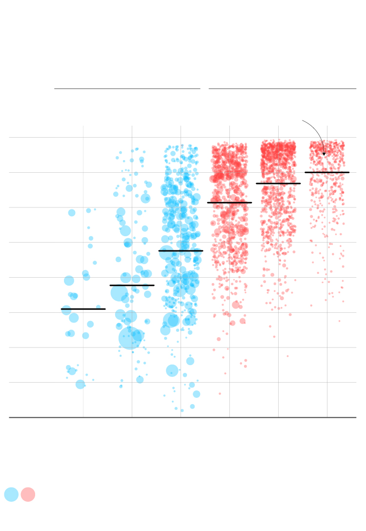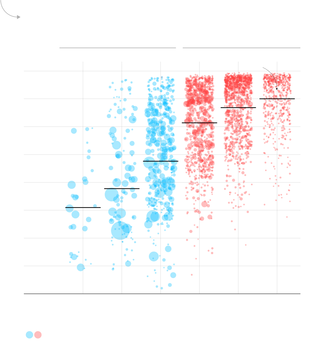 El corazón de Nueva York es el territorio más denso del país y también uno de los más demócratas. El condado de Esmeralda, en el desértico suroeste de Nevada, es uno de los más rojos —Trump obtuvo cinco veces más votos que Biden— y también uno de los menos densos, tiene casi 10.000 kilómetros cuadrados de superficie y solo 826 habitantes. Como se ve en el gráfico, los republicanos ganan en muchísimos más condados que los demócratas, pero son menos populosos: su escalera se construye a base de pequeños peldaños.