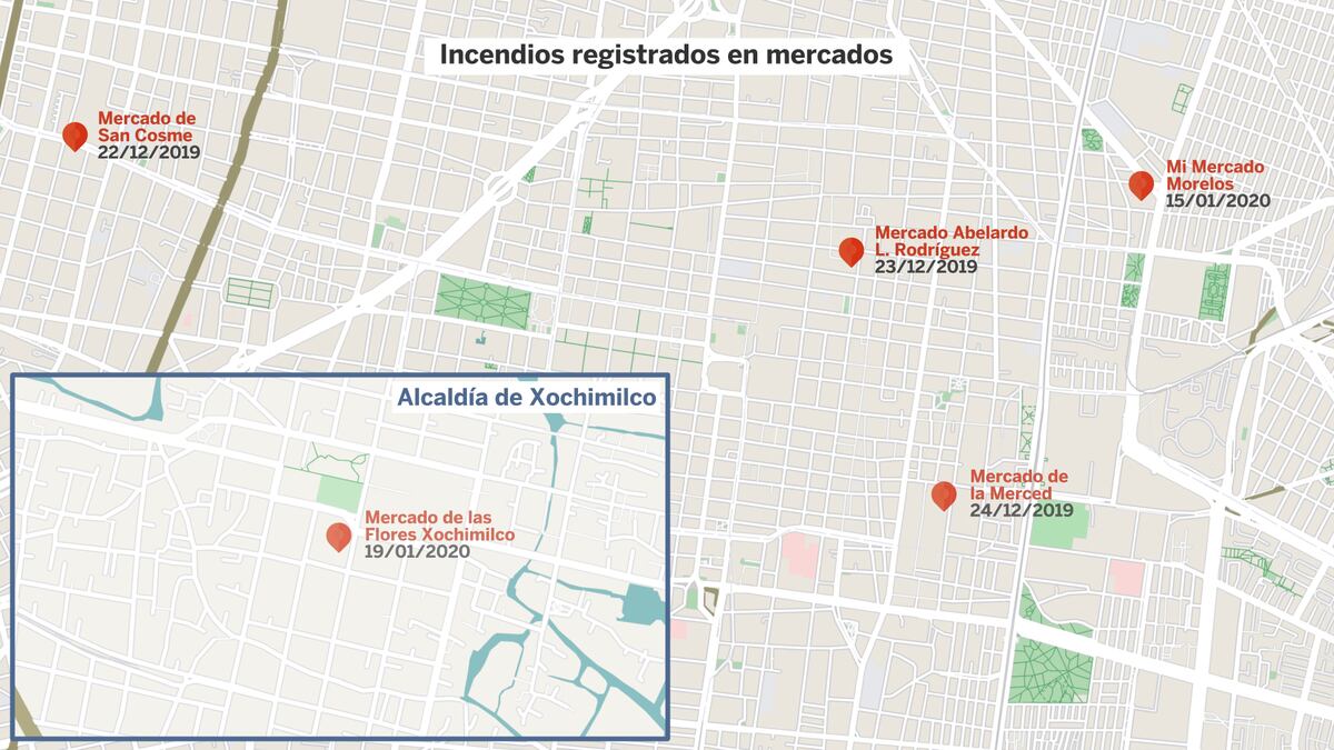 Primero fue el mercado de San Cosme el pasado 22 de diciembre, 188 locales fueron afectados. Un día después fue el mercado Abelardo L. Rodríguez, un local quedó calcinado. En Nochebuena se quemó La Merced, el mercado minorista más grande de la ciudad: dos personas murieron, al menos ocho más resultaron heridas y más de 600 locales terminaron abrasados. El 15 de enero ardió el mercado Morelos, con un saldo de 105 locales siniestrados. El último fue el mercado de Xochimilco el 19 de enero, con daños en 12 locales. En total, cinco incendios han estremecido a Ciudad de México en menos de un mes. Todos han sucedido de madrugada. Todos han asolado centros de consumo en zonas populares. Y todos, de acuerdo con los peritajes, han sido causados por cortocircuitos. La parquedad de las explicaciones multiplica las dudas entre los comerciantes y aumenta el desasosiego frente al reto de volver a ponerse en pie. "No les creemos", sentencia Carlos Pérez, un vendedor de La Merced de 61 años. "¿Pero ahora qué hacemos? ¿A quién culpamos?", se pregunta Pérez, frustrado.