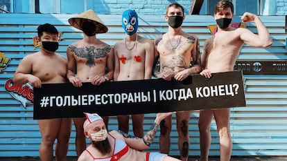 "Vamos desnudos porque nos han dejado sin nada", asegura Arthur Galaychyuk, propietario de una cadena de bares, Relab Family, en la ciudad de Kazán (1,5 millones de habitantes), en la república de Tartaristán. Sus 20 empleados han secundado la iniciativa. Los restaurantes de la ciudad podrán abrir sus terrazas a partir de mañana, tras dos meses de confinamiento.