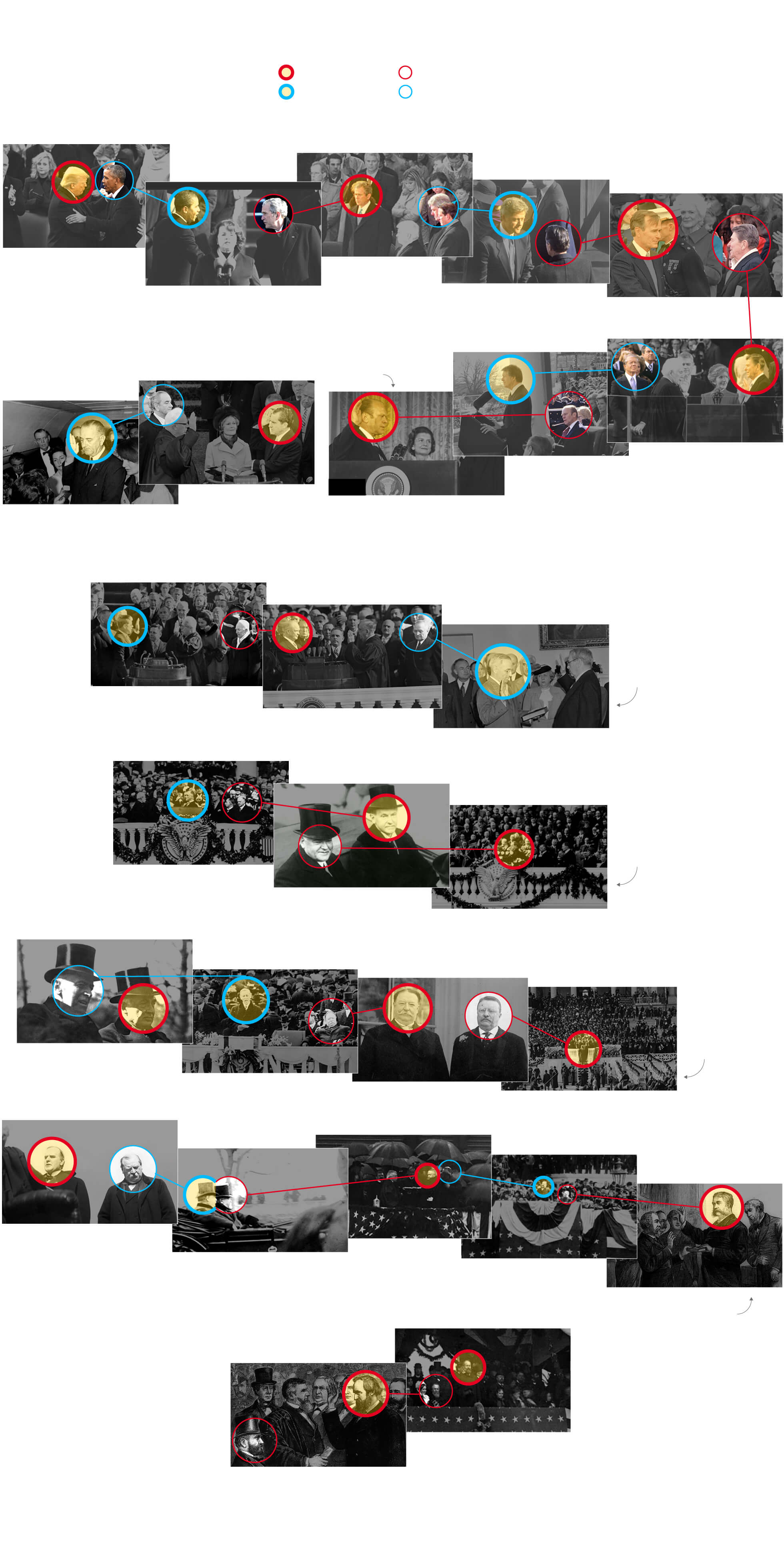 El republicano Ronald Reagan, en unas palabras dirigidas a su predecesor, el demócrata Jimmy Carter, explicó con elocuencia en su propia toma de posesión (1981) la importancia de esta costumbre: “A través de su amable cooperación en el proceso de transición, ha mostrado a un mundo expectante que somos un pueblo unido, comprometido a mantener un sistema político que garantiza la libertad individual en un grado que no lo hace ningún otro”. Y añadió: “A ojos de muchos en el mundo, esta ceremonia es un milagro”. Y aunque no siempre con tan buena armonía, desde que en 1877 el republicano Ulysess Grant dio el relevo al también republicano Rutherford Hayes, todos los presidentes salientes vivos —salvo Nixon que dimitió acorralado por el caso Watergate—, no han faltado a la investidura de sus sucesores.