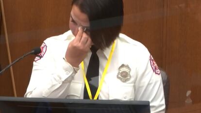 Genevieve Hansen, presente en la escena del crimen cuando estaba fuera de servicio, no puede contener las lágrimas durante el juicio que se celebra en Minneapolis