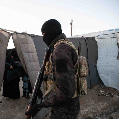 Las tanquetas avanzan sobre el camino de tierra en la parte del campo en la que viven poco más de 30.000 iraquíes. Entre las familias de yihadistas llegadas del vecino Irak —durante un lustro el califato se extendió entre ese país y Siria, y sometió a 7,7 millones de personas— hay también 9.000 desplazados que fueron arrastrados en su huida de los combates contra el ISIS. Samira ordena con un movimiento de manos la salida de su tienda de una horda de críos. Oriunda de la región iraquí de Ambar, llegó a este campo sirio hace dos años. Al igual que otras 1.900 familias, se ha registrado en las listas de la ONU para la repatriación. “Todos los días hay peleas entre ellos”, explica. Por “ellos” se refiere a quienes intentan imponer las normas del califato en Al Hol y los que rechazan obedecerlas.