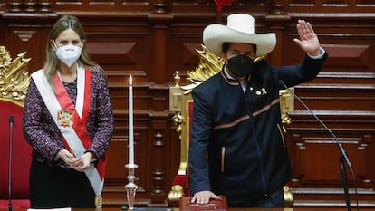 Pedro Castillo, con la mano derecha en la Biblia y la izquierda en alto, tomó este miércoles posesión como presidente de Perú. El maestro de escuela llevaba su característico sombrero de palma y una chaqueta azul sin cuello. Llegó al Congreso sin pisar la alfombra roja desplegada en la entrada en su honor. Allí se enfundó la banda presidencial el hijo de unos agricultores analfabetos que viven en un poblado remoto de los Andes. Los padres asistían al momento desde un palco. Castillo es, sin duda, el presidente más outsider de la historia del país. Cuando se presentó no tenía ninguna conexión en Lima, donde a menudo se decide el destino de la nación. El día que ganó la primera vuelta se despertó antes del amanecer y descendió descalzo una colina para ordeñar una vaca. Su llegada a la presidencia tiene un enorme poder simbólico.