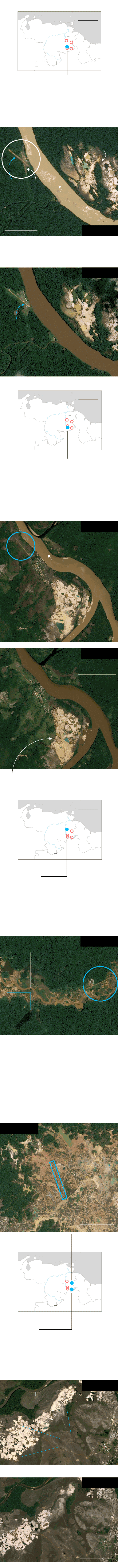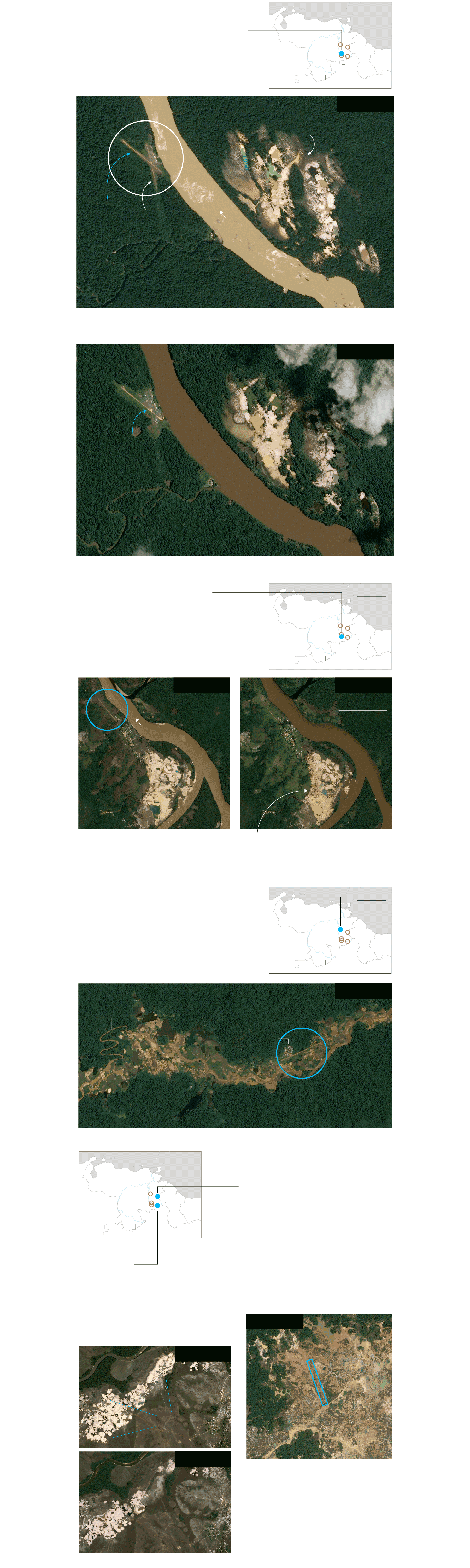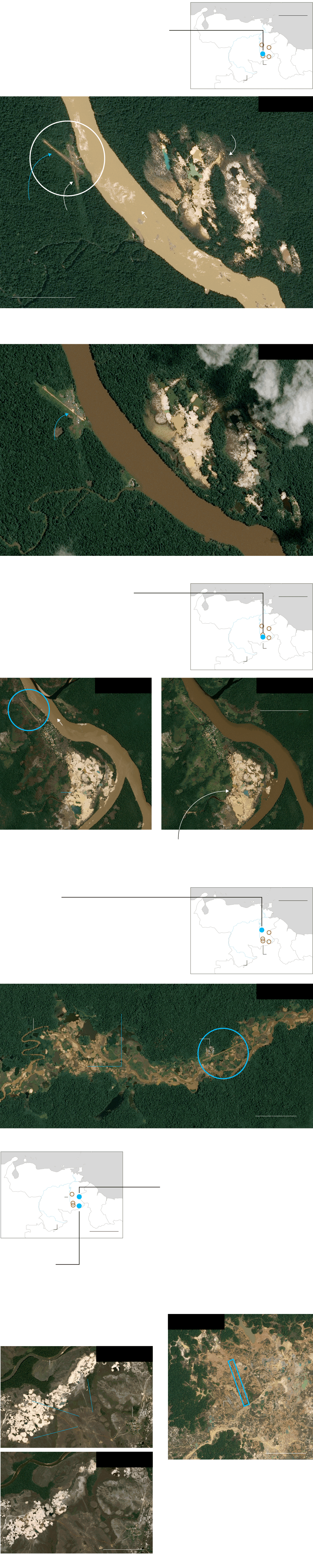 La proximidad que existe entre pistas y minas clandestinas se puede comprobar, por ejemplo, en el punto correspondiente a las coordenadas 4°45′25.2″N 61°29′07.2″W. En ese sitio de la Gran Sabana se observa una pista en medio de un territorio donde se hace evidente la expansión de minas a cielo abierto desde 2015, según se constató en un seguimiento histórico del satélite Sentinel-2 de la Agencia Espacial Europea (ESA). La Gran Sabana, al sureste del estado Bolívar, constituye un paraje y ecosistema singulares, una altiplanicie de 10.000 kilómetros cuadrados que sirve de umbral de acceso a la región de los tepuyes, macizos característicos del Escudo Guayanés.