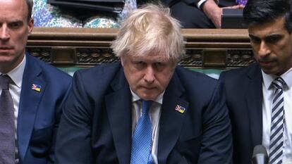 Se equivocó, pero no delinquió. A pesar de que la Policía Metropolitana hubiera decidido la semana pasada imponer a Johnson, a su esposa Carrie Symonds, y a su ministro de Economía, Rishi Sunak, multas respectivas por valor de 60 euros cada una. Y de que fuera la única vez en la historia en que un primer ministro había sido sancionado por su conducta ilegal. “Permítanme decirles, sin pretender que suene a excusa, sino para poder explicar mis palabras, que nunca se me ocurrió, ni en ese momento ni posteriormente, que aquel encuentro de personas en la sala del Consejo de Ministros [la fiesta sorpresa de cumpleaños del 19 de junio de 2020], justo antes de que celebráramos una reunión estratégica para responder ante la covid-19, pudiera suponer un quebrantamiento de la ley”, ha dicho a los diputados el primer ministro británico. Johnson preparaba ya los argumentos para el intenso debate que tendrá lugar este jueves en el Parlamento. Su presidente (speaker), Lindsay Hoyle, ha dado luz verde a la moción presentada por la oposición laborista para que pueda votarse si la conducta de Johnson merece ser sometida a la investigación y juicio de la Comisión de Privilegios de la Cámara (similar a la española Comisión del Estatuto del Diputado), por posible desacato al Parlamento.