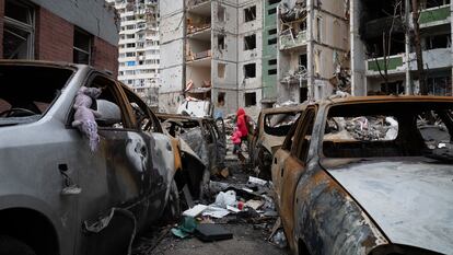 El apartamento de Velianinova está en un quinto piso y el impacto, aún claramente visible, fue a la altura del segundo. “Oí como algo muy pesado viniendo hacia aquí, como una máquina de hierro viniendo por el aire”, recuerda. “Se encendió en mí algún tipo de instinto de supervivencia y envié a mi madre y a mi hija a refugiarse al pasillo. Les dije: ‘No tengáis miedo’. Y justo entonces fue el sonido del ataque. Unos segundos después entendimos que había sido justo contra el edificio. Cuando me levanté y miré por la ventana, recuerdo algo así como trozos de muebles salidos por las ventanas y cinco coches ardiendo enfrente”, cuenta mientras encadena cigarrillos. Ya en la calle, y junto al chasis calcinado de los vehículos, Velianinova se despide con tres palabras y poca convicción: “Todo irá bien”.