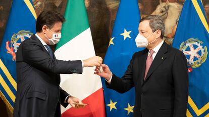 Italia había tenido en dos años y medio dos gobiernos de signo opuesto en cuya foto siempre aparecían el Movimiento 5 Estrellas y Giuseppe Conte, convertido casi por casualidad en primer ministro. Fueron años de turbulencias, populismo y amenazas a Europa. Pero la crisis que se avecinaba derivada de la pandemia, los problemas en la campaña de vacunación y los tradicionales movimientos sísmicos parlamentarios provocaron la segunda crisis de gobierno de la legislatura. El presidente de la República, Sergio Mattarella, echó un vistazo a lo que en Italia se conoce como “las reservas del Estado” y eligió al hombre con mayor autoridad y prestigio del país: Mario Draghi. El expresidente del Banco Central Europeo (BCE) dudó un tiempo. Su leyenda corría el riesgo de verse mancillada por el fango de la política. Pero la idea de liderar un Gobierno de unidad nacional que legitimase democráticamente lo que las urnas no le habían dado terminó de convencerlo. Solo 17 meses después, ese elemento se ha esfumado.