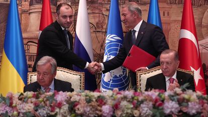 Los representantes de Ucrania y Rusia no se han cruzado en ningún momento. Primero firmaron el acuerdo los ministros de Defensa de Rusia, Serguéi Shoigú, y de Turquía, Hulusi Akar. A los pocos segundos, selló el acuerdo el ministro de Infraestructuras de Ucrania, Oleksandr Kubrakov, con el representante turco.