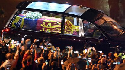 Decenas de miles de personas desafiaron este martes la lluvia londinense para recibir el féretro de Isabel II, en su último viaje a su residencia oficial durante 70 años: el Palacio de Buckingham. Un avión militar ha transportado el cuerpo de la monarca fallecida desde Edimburgo hasta la base aérea de Northolt, a poco más de 22 kilómetros del centro de la capital. A pie de pista esperaban, entre otros, la primera ministra del Reino Unido, Liz Truss, y el ministro de Defensa, Ben Wallace. En completo silencio, una guardia de honor ha sacado el féretro de la aeronave, para introducirlo en el coche fúnebre, un vehículo diseñado conjuntamente por la Casa Real y la compañía automovilística Jaguar Land Rover. El color: Royal Claret, ese granate oscuro que los británicos identifican de inmediato con la Casa de los Windsor.