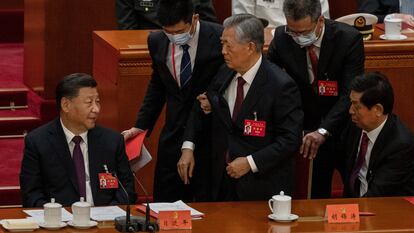 Pocas veces las pugnas políticas suceden en China a cara descubierta. Pero este sábado, el XX Congreso del Partido Comunista —el que estaba destinado a elevar al actual líder, Xi Jinping, a unas cotas de poder solo alcanzadas en la República Popular por Mao Zedong— ha arrancado con una imagen insólita cargada de simbolismo sobre el final de una época y el principio de otra. El expresidente Hu Jintao, de 79 años, que comandó el país en la década previa a Xi, cercano al saliente primer ministro, Li Keqiang, ha sido visiblemente forzado a abandonar el escenario, a pesar de oponer resistencia.
