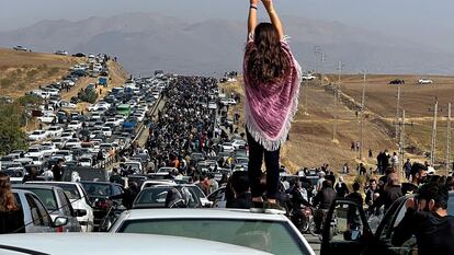 La agencia ISNA reconoció finalmente que la ceremonia estaba teniendo lugar. Antes de aludir a los enfrentamientos, este medio semioficial había negado que las fuerzas de seguridad hubieran bloqueado el paso en las carreteras que llevan al cementerio y asegurado que la celebración estaba transcurriendo “sin ningún tipo de conflicto o tensión con las fuerzas policiales presentes en las calles de la ciudad”. Sin embargo, en los vídeos difundidos en redes sociales, se oía a docenas de personas corear los dos lemas más repetidos de las protestas: “Mujer, vida y libertad” y “Muerte al dictador”, en alusión al líder supremo de Irán, el ayatolá Ali Jamenei. Las imágenes mostraban a mujeres sin velo o que se habían despojado de él y lo agitaban en el aire.