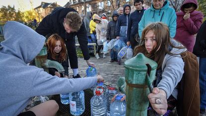 Hasta el 80% de la población de la ciudad, con unos tres millones de habitantes antes de la invasión, se ha quedado sin agua, según el alcalde Klichko. Las autoridades han pedido a la población que acumule agua o la compre dentro de sus posibilidades. En las fuentes públicas hay ciudadanos haciendo cola mientras rellenan garrafas y botellas de plástico que cargan en carritos, pero en los dos supermercados visitados por EL PAÍS no había escasez de agua en las estanterías.