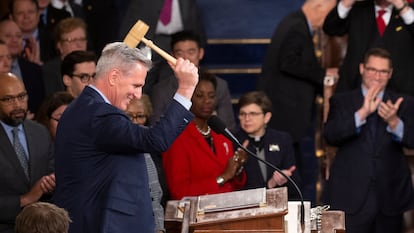 Kevin McCarthy ha estrenado su mazo de speaker en la madrugada de este sábado en Washington, por la mañana en la España peninsular española. El nuevo presidente de la Cámara de Representantes ha empezado a ejercer el cargo tras ser elegido en una sesión dramática tras cuatro días que han desembocado en una noche alta tensión. McCarthy ha dado su primer discurso de la legislatura en el que ha expuesto sus prioridades con una mezcla difícilmente compatible de llamadas a la unidad y de promesas de dura oposición al Gobierno de Joe Biden. Visiblemente satisfecho con su agónico nombramiento, ha dicho: “Espero que una cosa quede clara después de esta semana: no me rindo nunca”.