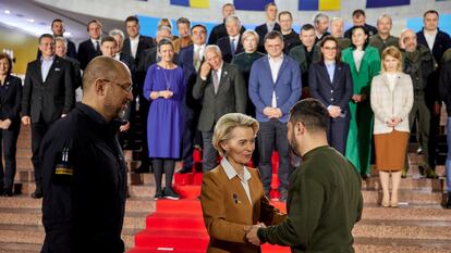 Europa nunca ha estado tan cerca de Kiev. Física y simbólicamente. En una visita histórica a la capital ucrania en plena guerra, la presidenta de la Comisión Europea, Ursula von der Leyen, acompañada de 15 comisarios, entre ellos algunos vicepresidentes, mostró su férreo apoyo el jueves al Gobierno del presidente Volodímir Zelenski en su camino a la integración a la UE. El viaje, en vísperas de una importante cumbre entre Ucrania y la UE que se celebra este viernes en Kiev, certifica que la Unión ha entrado de lleno en un espacio que Moscú —que trata por todos los medios de arrebatarle la soberanía al país vecino— considera dentro de su área de influencia. Bruselas busca así demostrar a la Rusia imperialista de Vladímir Putin que, aunque la UE no va a intervenir militarmente en Ucrania —algo políticamente impensable—, no dejará solo al país del Este, que hace años dio el giro definitivo hacia Occidente en detrimento de la influencia rusa.