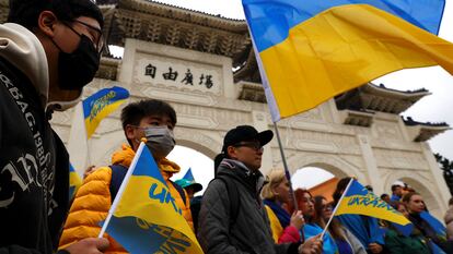 En la manifestación se mezclan los rostros asiáticos y europeos, se ve una miríada de banderas y mascarillas de color azul y amarillo, y un puesto ofrece parches para coser a la ropa con las insignias de Taiwán y de Ucrania entrelazadas. Al cumplirse un año de la invasión de Rusia a Ucrania y en esta isla autogobernada, que China considera parte inalienable de su territorio y a la que Estados Unidos ayuda militarmente, muchos trazan paralelismos entre lo que es vivir a la sombra de dos gigantes. “¡Somos como dos velas en una habitación muy oscura!”, proclama Miao Poya, una política y activista taiwanesa, concejal en Taipéi por el partido socialdemócrata, que acaba de tomar el escenario. “¡Con nuestros sacrificios queremos iluminar la democracia y la libertad en el mundo!”.