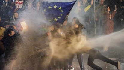 Alrededor de ella se unieron otros activistas que empuñaban la bandera de la UE, a pesar de que la fuerza del agua los propulsaba hacia atrás. Protestaban contra un proyecto de ley que acababa de aprobar en primera lectura el Parlamento, la conocida como ley de los agentes extranjeros, y que finalmente fue retirado el pasado viernes por las protestas que desató. La norma, inspirada en una legislación rusa implantada en 2012, contemplaba multas y penas de hasta cinco años de cárcel para todos los medios, ONG y activistas que recibieran de fuera del país al menos el 20% de sus fondos. En Rusia ha permitido desde entonces cerrar medios independientes y encarcelar a varias personas.