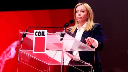 La líder ultraderechista, en pleno proceso de organizar un proyecto político hegemónico, es la primera jefa del Gobierno en 27 años que da un discurso en el encuentro del CGIL