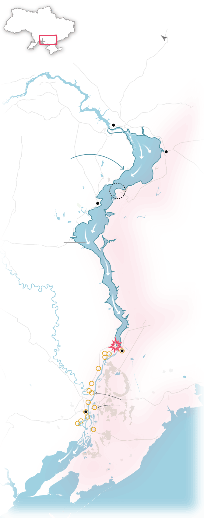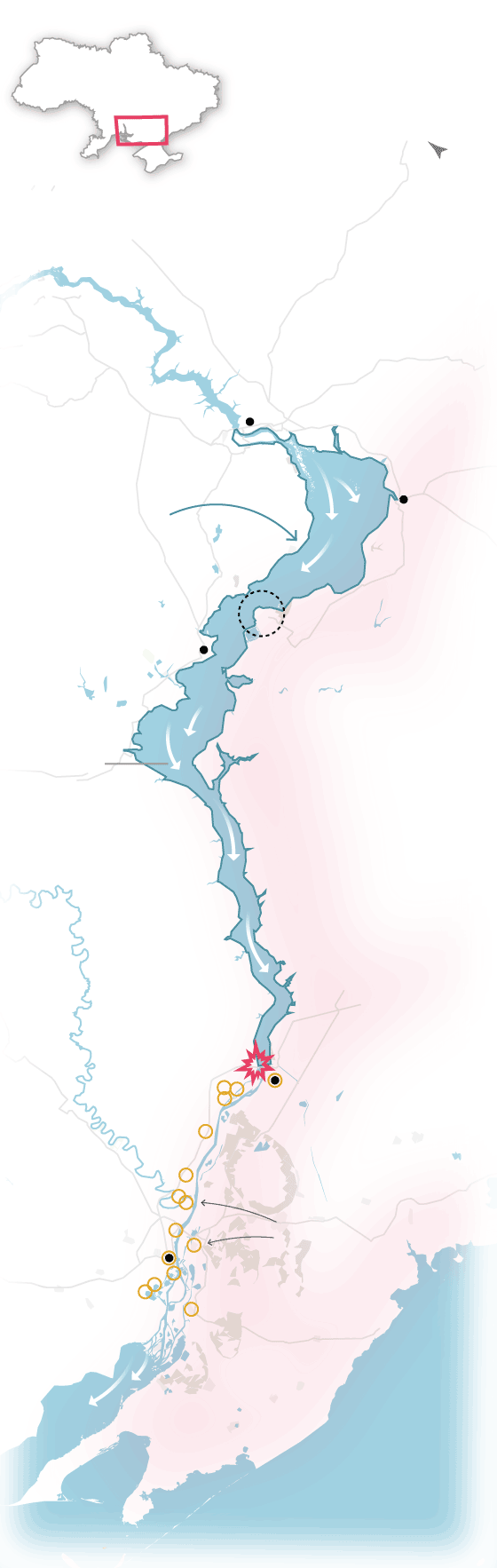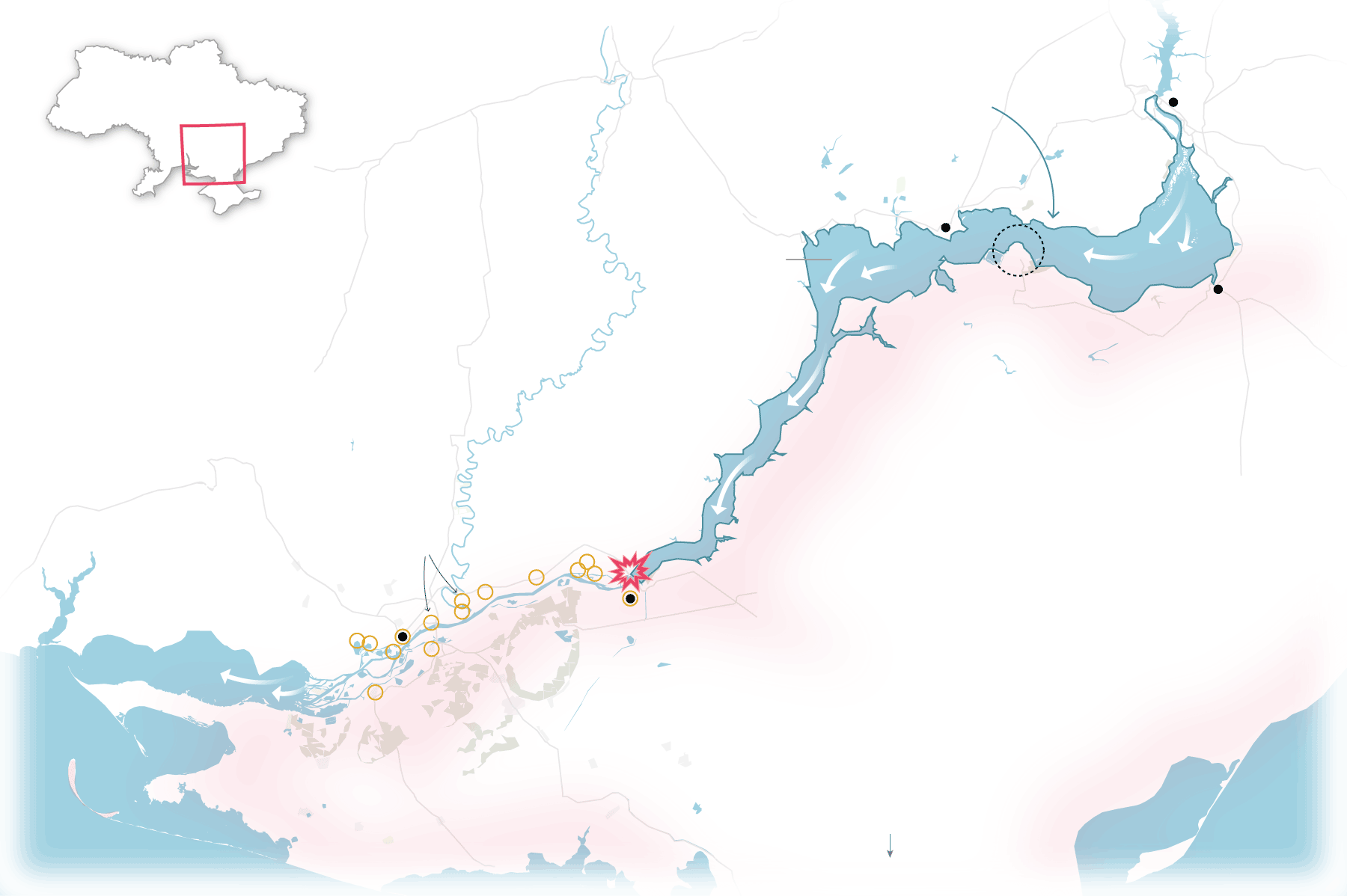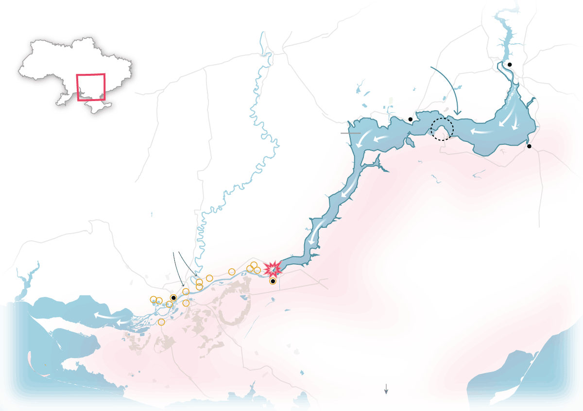 El derrumbe de la presa de la central hidroeléctrica de Nova Kajovka afecta especialmente a los habitantes de las poblaciones situadas en las orillas del río Dniéper en su recorrido hasta el mar Negro, pero también dificulta la contraofensiva ucrania iniciada el pasado lunes. La rotura del dique no supone una amenaza para la red eléctrica del país, según afirma el Gobierno ucranio, pero se trata de una zona crítica para el abastecimiento de agua a la península de Crimea, ocupada por Rusia.