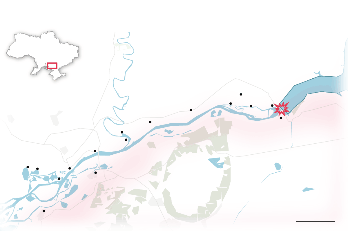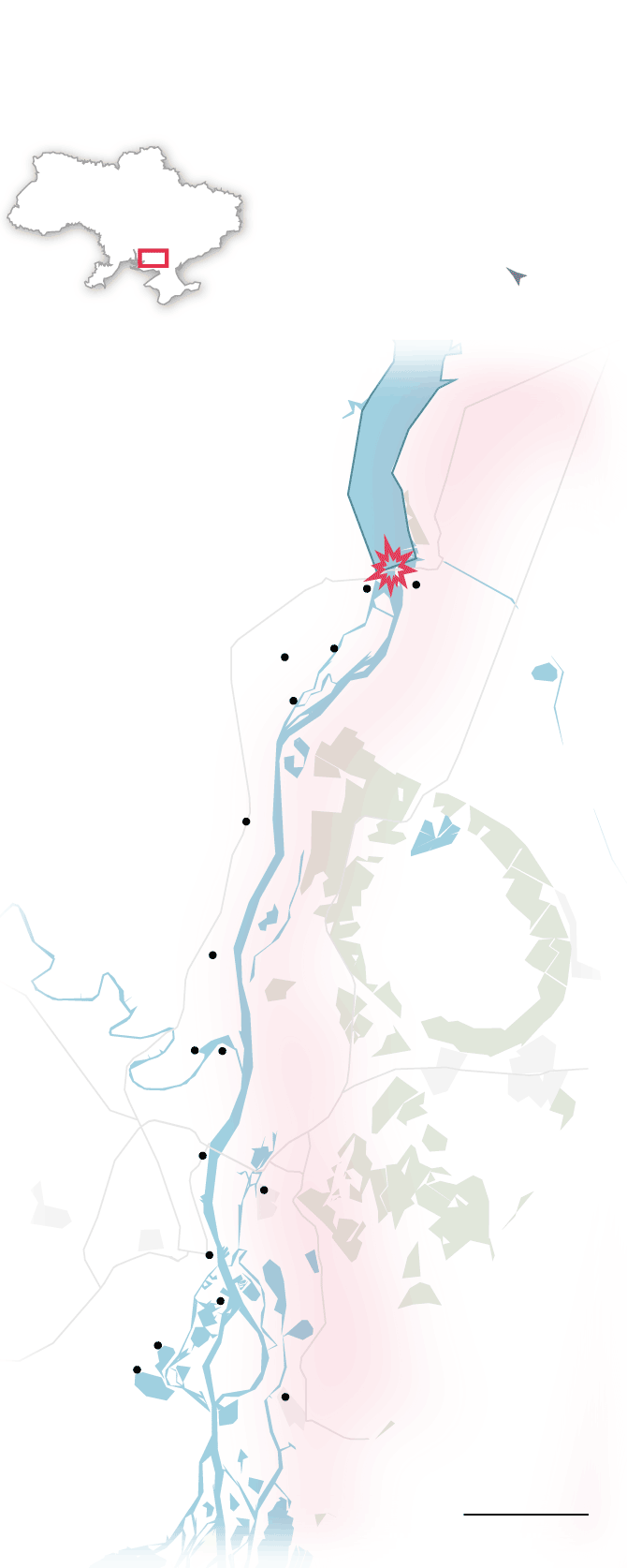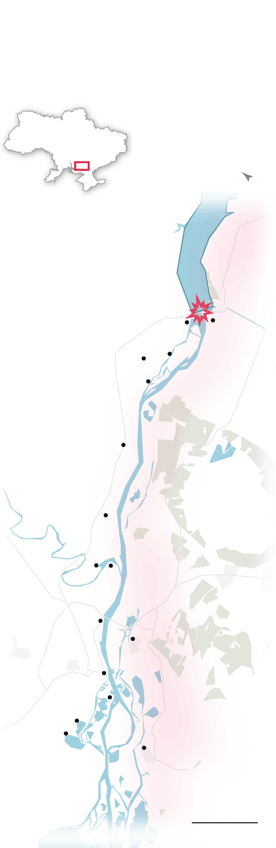 La población afectada. El cauce del Dniéper es actualmente la frontera entre ambos contendientes en el sudeste del país, desde la retirada de las fuerzas del Kremlin de la orilla occidental el pasado noviembre. Los rusos controlan el territorio del margen oriental del río (el izquierdo si se va a favor de la corriente). Nova Kajovka, municipio de 45.000 habitantes (antes de la guerra), se encuentra en esta parte del río, bajo control de las tropas invasoras rusas. El nivel del agua había subido en la tarde del martes cerca de 12 metros, según informa Efe. De esta localidad se han evacuado cerca de 900 personas, según los servicios de emergencia rusos.