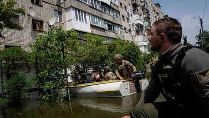 El puente que conecta Barativka con Yelizavetivka también ha quedado bajo el agua. Unos vecinos indican que el Ingulets, en ese punto, ha pasado de tener 50 metros de anchura a un kilómetro. El ejército se aprestaba el jueves a levantar una cadena de embarcaciones para rescatar a los vecinos sitiados. Al mismo tiempo, Oleg, un residente de Jersón, se subía a una pequeña barca de plástico para inspeccionar la casa de su abuela, desde el miércoles bajo el agua. En el camino rescató a dos perros abandonados que no se atrevían a nadar hasta la orilla. “Esta casa es mi infancia, donde pasé tantos veranos, y ahora se ha ido”, musitaba Oleg, aguantando la emoción, mientras remaba de vuelta a tierra firme.